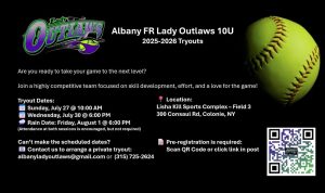 The Frozen Ropes Lady Outlaws 12u team is seeing to add a dedicated Catcher/Utility player to our 2026 team roster. This position includes participation in winter workouts and the opportunity for private lessons and unlimited cage rentals at our indoor facility in Albany, NY. We encourage enthusiastic and committed athletes who are passionate about softball and desire to be a part of a strong team environment to contact us.